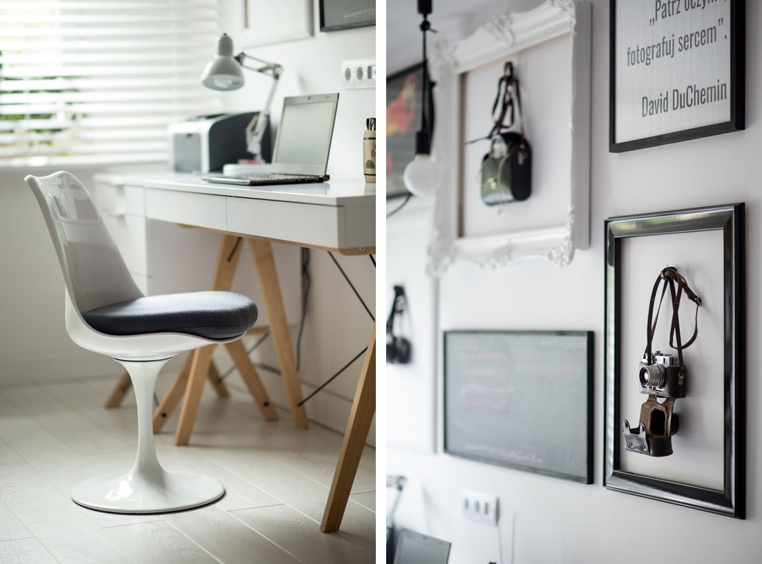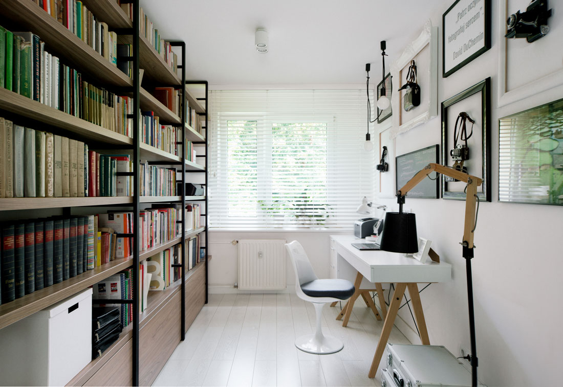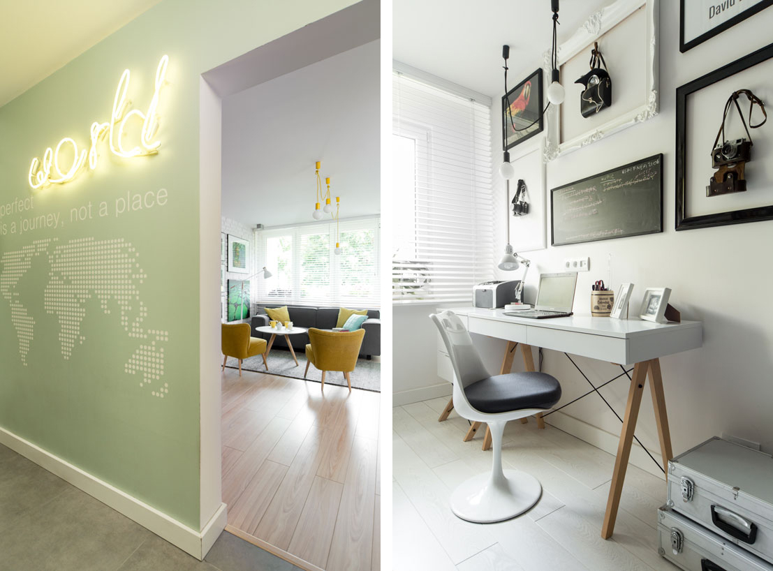 Căn hộ chung cư được thiết kế với một không gian mở tao sự thông thoáng tối đa. Cũng dể dàng nhận thấy một câu trích dẫn về du lịch được đưa vào bức tường lớn cùng với những bức ảnh và những vật dụng nhiếp ảnh được bài trí một cách độc đáo, thể hiện cá tính của chủ nhân về tình yêu nhiếp ảnh