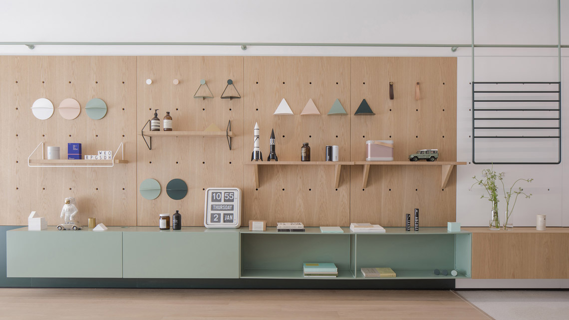 Người thiết kế cũng tạo một bức tường đồ nội thất dạng mô-đun. Các lỗ đục trên gỗ theo mô hình lưới cho phép các kệ và phụ kiện dễ dàng được đặt và sắp xếp lại để phù hợp với nhu cầu sinh hoạt của gia đình.