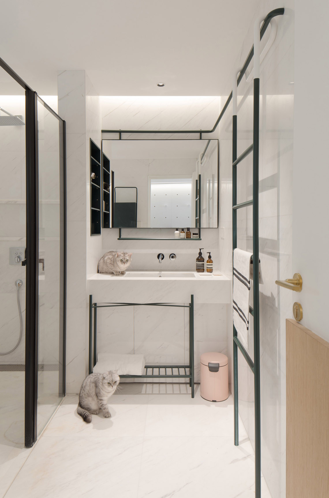 Dọc phía đối diện của căn phòng, một bảng điều khiển cuộc sống và bàn điều khiển bàn giao khác cung cấp một khu vực kệ, màn hình và lưu trữ tùy chỉnh. Lan can chạy dọc bên ngoài tủ quần áo, và bên trong phòng tắm nơi giá đỡ gấp đôi như một thanh treo khăn.
