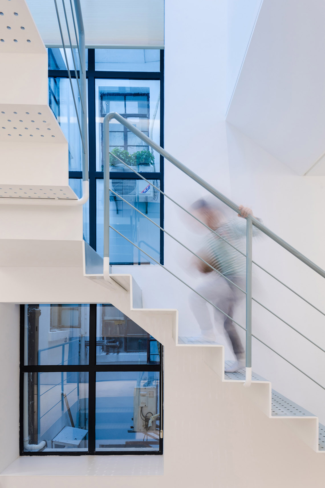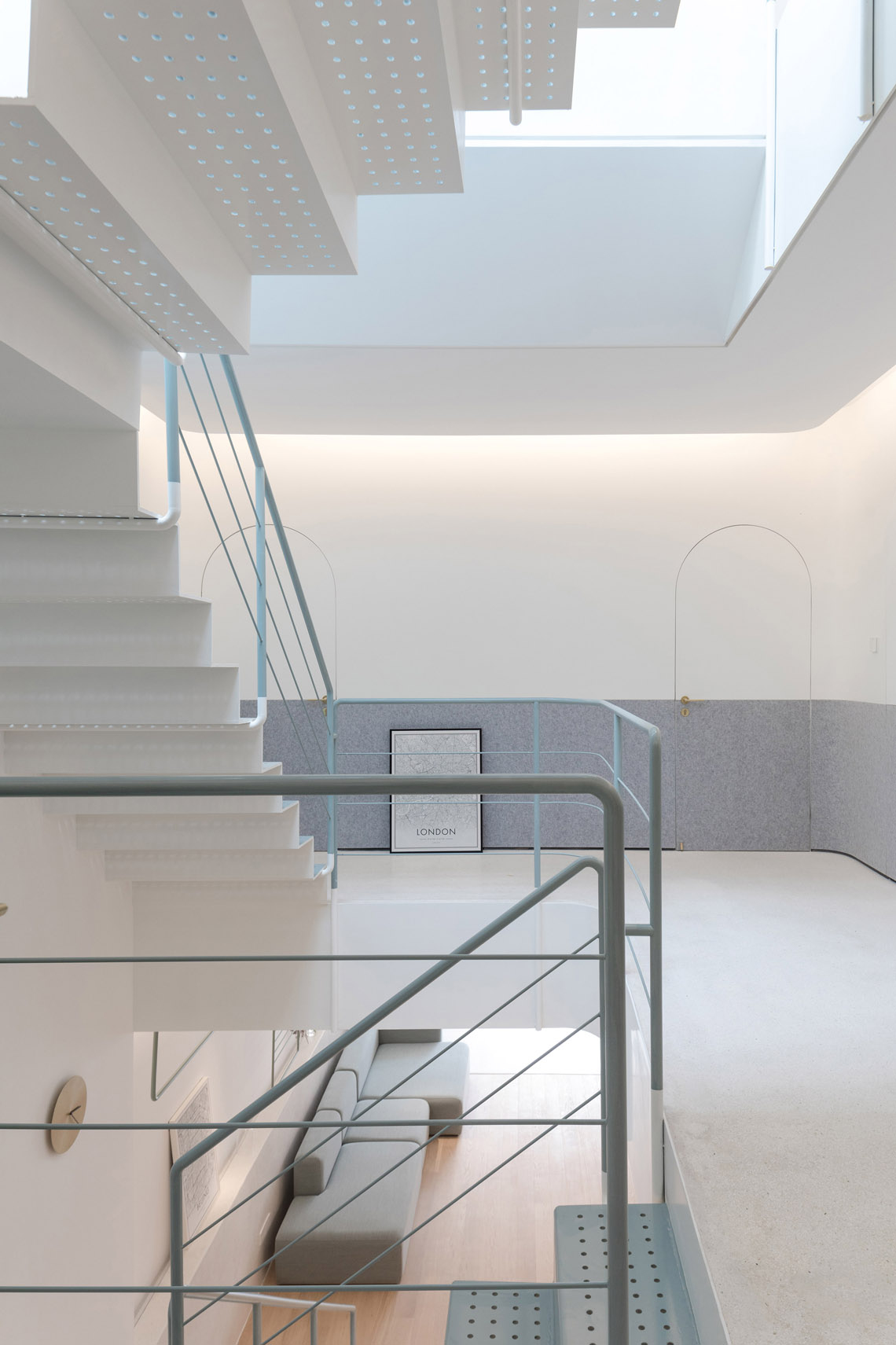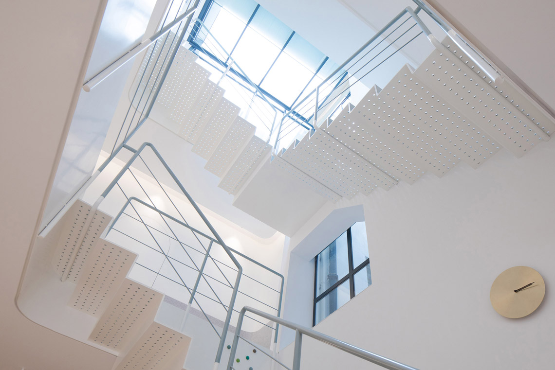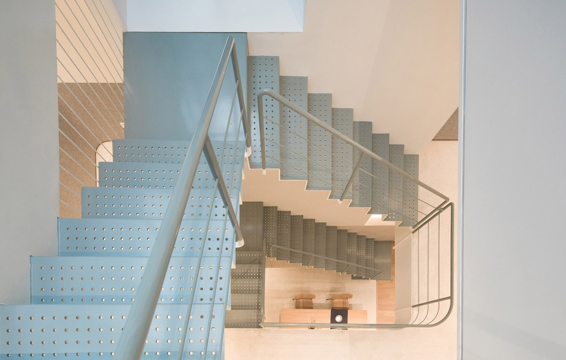 Một giếng trời lớn hiện đang nằm phía trên cầu thang, giật xuống từng cấp thông thóang, hàng loạt lỗ tròn được khoan vào các tấm thép của cầu thang cho ánh sáng suyên qua.