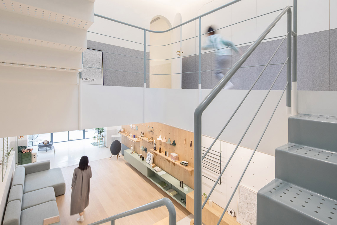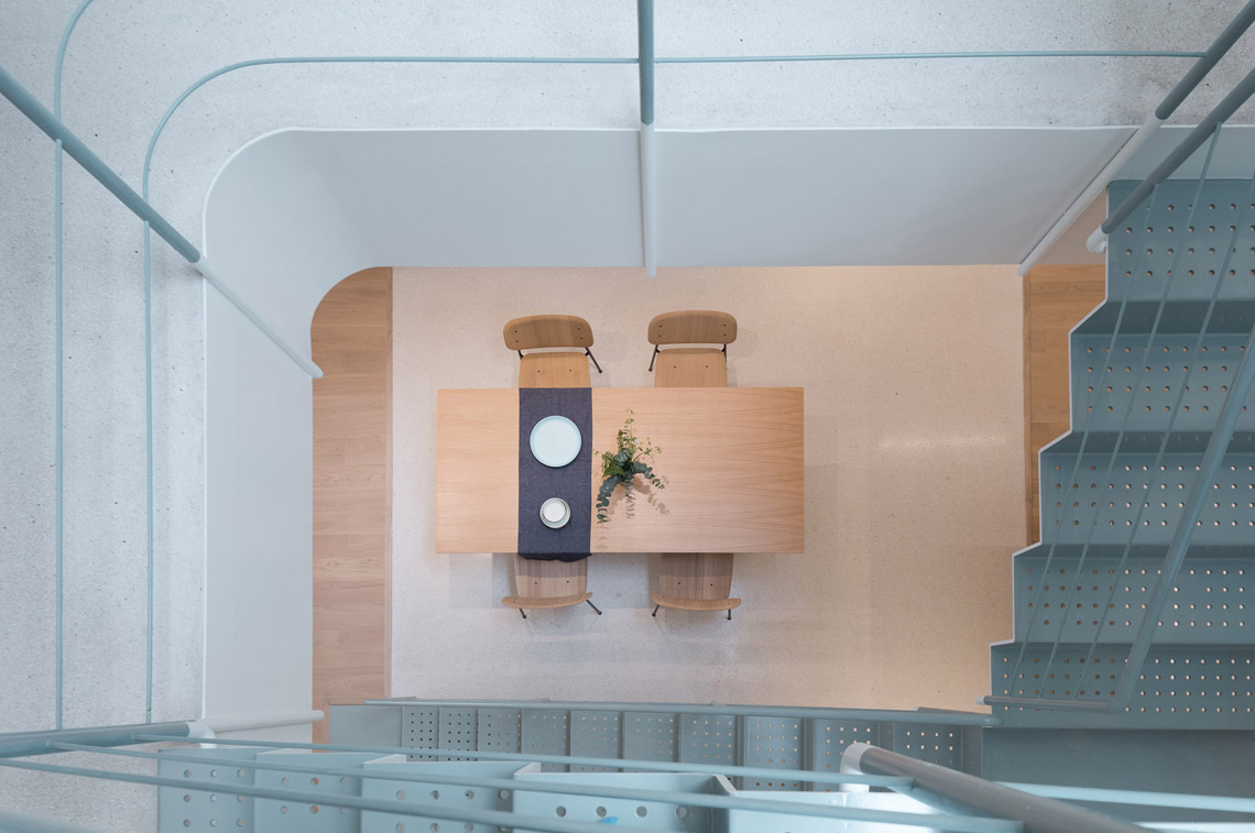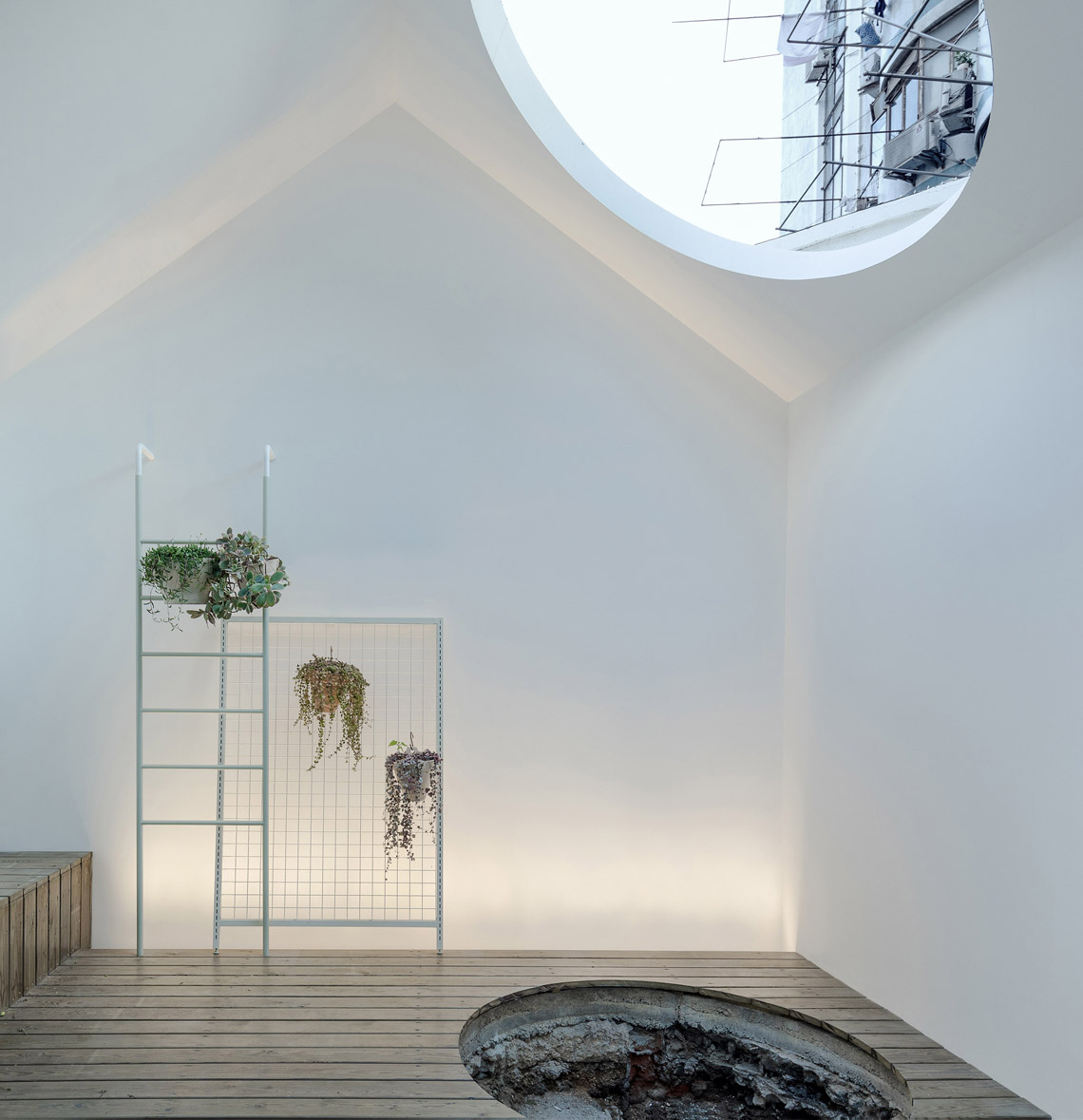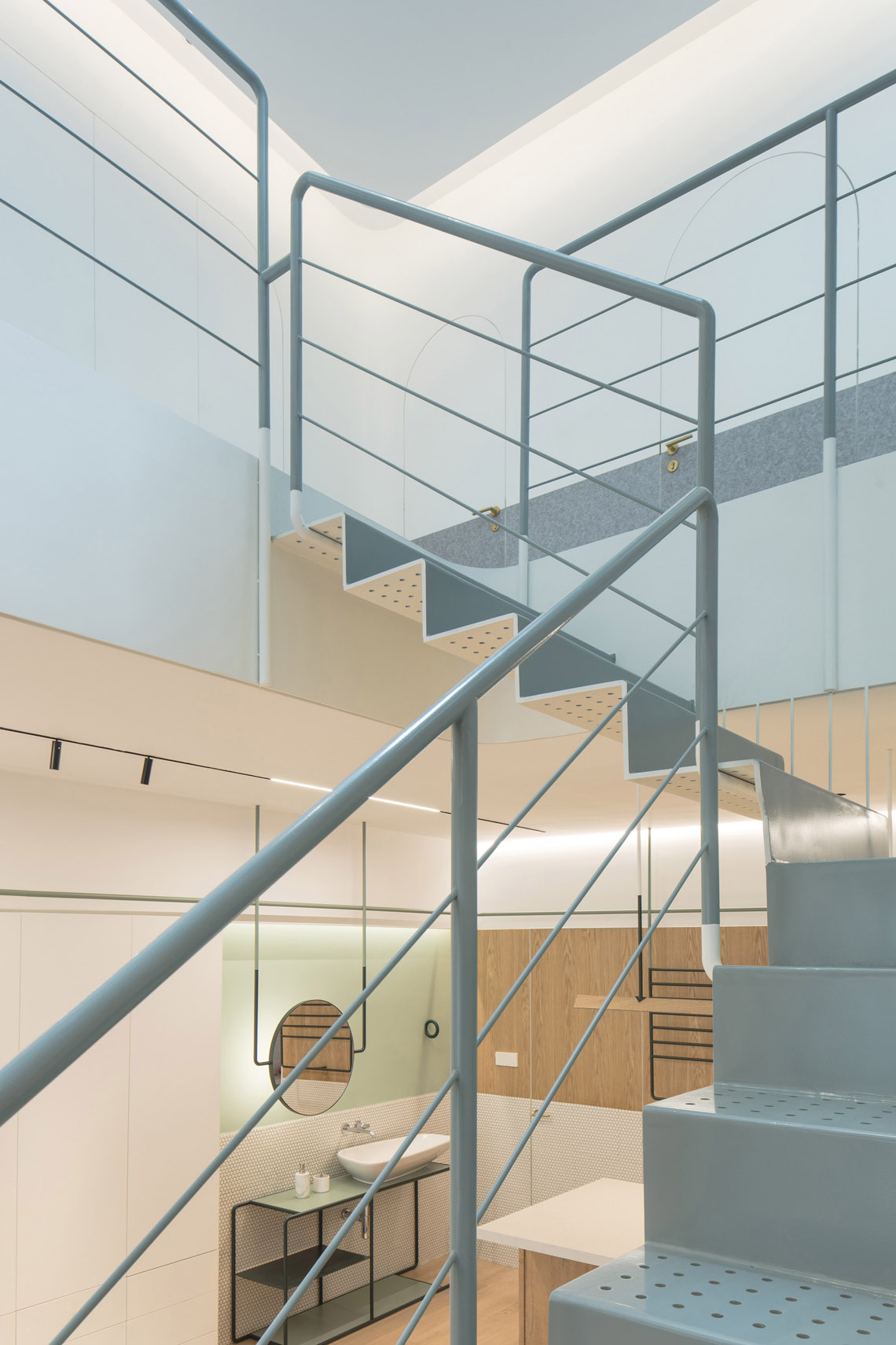 Một giếng trời lớn hiện đang nằm phía trên cầu thang, giật xuống từng cấp thông thóang, hàng loạt lỗ tròn được khoan vào các tấm thép của cầu thang cho ánh sáng suyên qua.