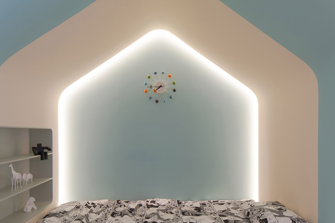 Chiếc giường nằm bên trong một hốc tường được cắt ra theo hình góc mái ngôi nhà , với các kệ bên trong và đèn nền xung quanh các cạnh. Một chiếc bàn cũng đã được đặt vào tường với kệ và không gian lưu trữ bổ sung ở trên.