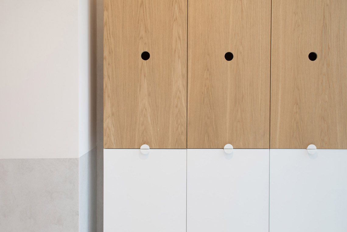 Ván sàn gỗ nhạt đã được sử dụng cho khu vực sinh hoạt và nhà bếp. Các bức tường đều có màu trắng, với một màu xám nhạt được sử dụng ở nửa dưới cho khu vực sinh hoạt, trong khi nhà bếp được lát bằng gạch hình lục giác nhỏ màu trắng với vữa màu tối.