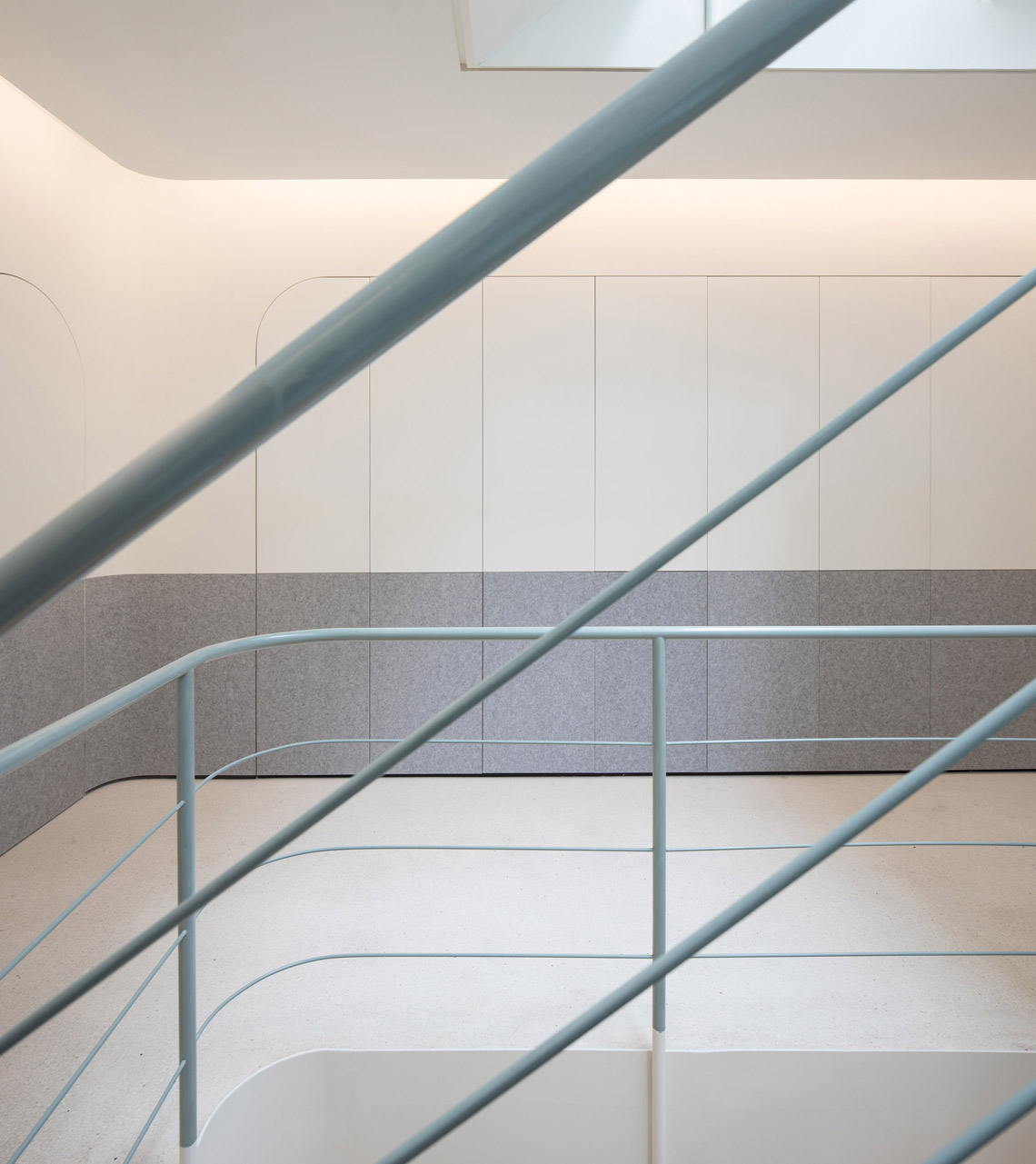 Các cuộc đổ bộ được sơn màu trắng, với các tấm nỉ màu xám bao phủ nửa dưới. Cửa vào các phòng được làm tròn ở trên cùng, cũng như các cạnh của khu vực kho ẩn trong hành lang.